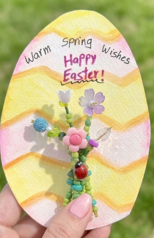 In this hands-on class, you’ll learn the art of bead-weaving and assembly to create charming floral stems, sparkling accents, and even a tiny ladybug friend. Whether you’re looking to decorate your Easter table or create a handmade gift, this session is all about spending your time creatively making beaded bouquet and Painting easter egg card with watercolor.